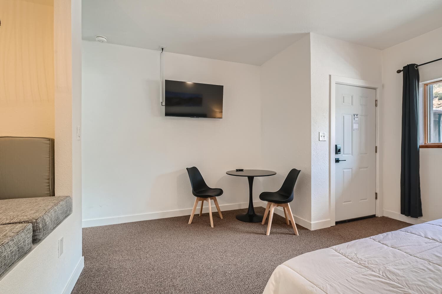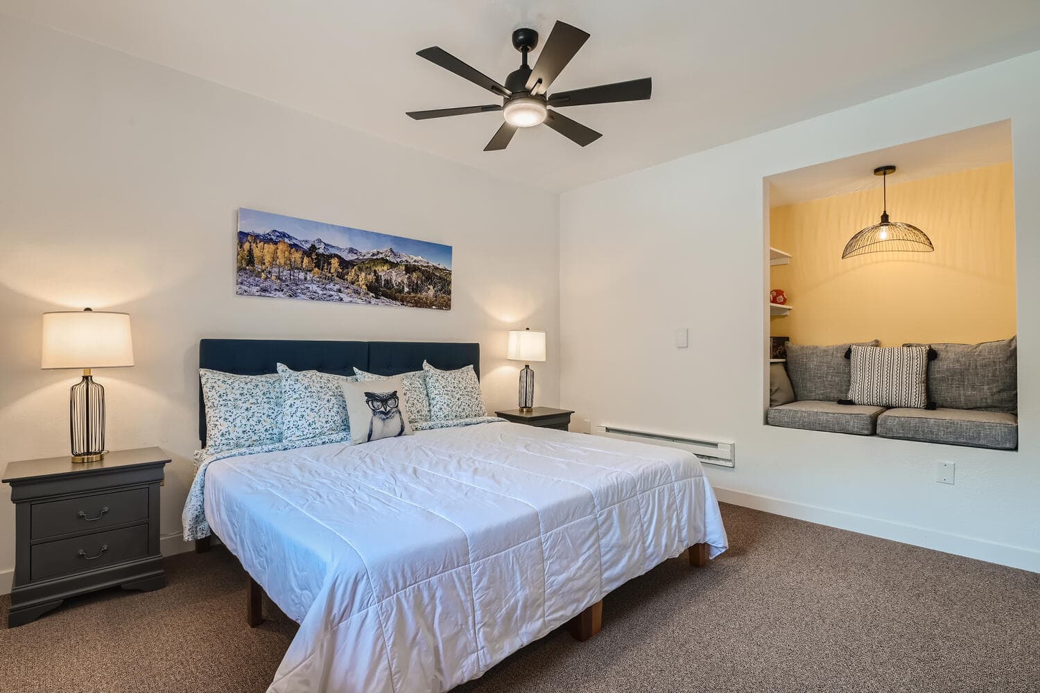 One King Bed. Custom reading nook with bistro table. Private bathroom with shower. 2nd floor via stairs.